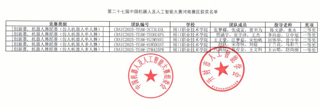 中国机器人及人工智能大赛作为教育部认可的全国赛事,已进入《全国普通高校学科竞赛排行榜》,是国内规模最大、影响力最强、专业水平最高,是检验高校机器人及人工智能领域教学成果与员工实践能力的重要平台。在第二十七届中国机器人及人工智能大赛河南省选拔赛中表现突出,斩获省赛一等奖3项、二等奖2项,并全部晋级国赛,斩获国赛二等奖3项、优秀奖1项。