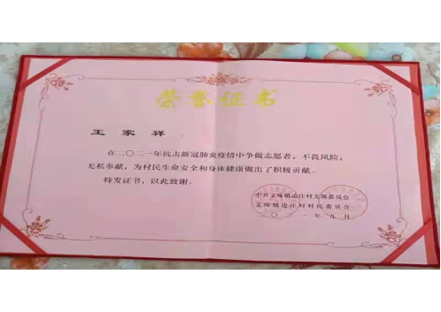 为响应国家号召,球盟会公司奖学金获得者20级应电电气一班王家祥,志愿加入河南省许昌市禹州市文殊镇边庄村疫情防控工作小组,对村里来往人员进行人员信息登记、体温检测、宣传防疫知识、根据在公司学到的知识活学活用,充分展现了当代老员工的风貌。疫情当前,处处是“战场”,人人是“战士”,面对疫情每个人都是一道“长城”。