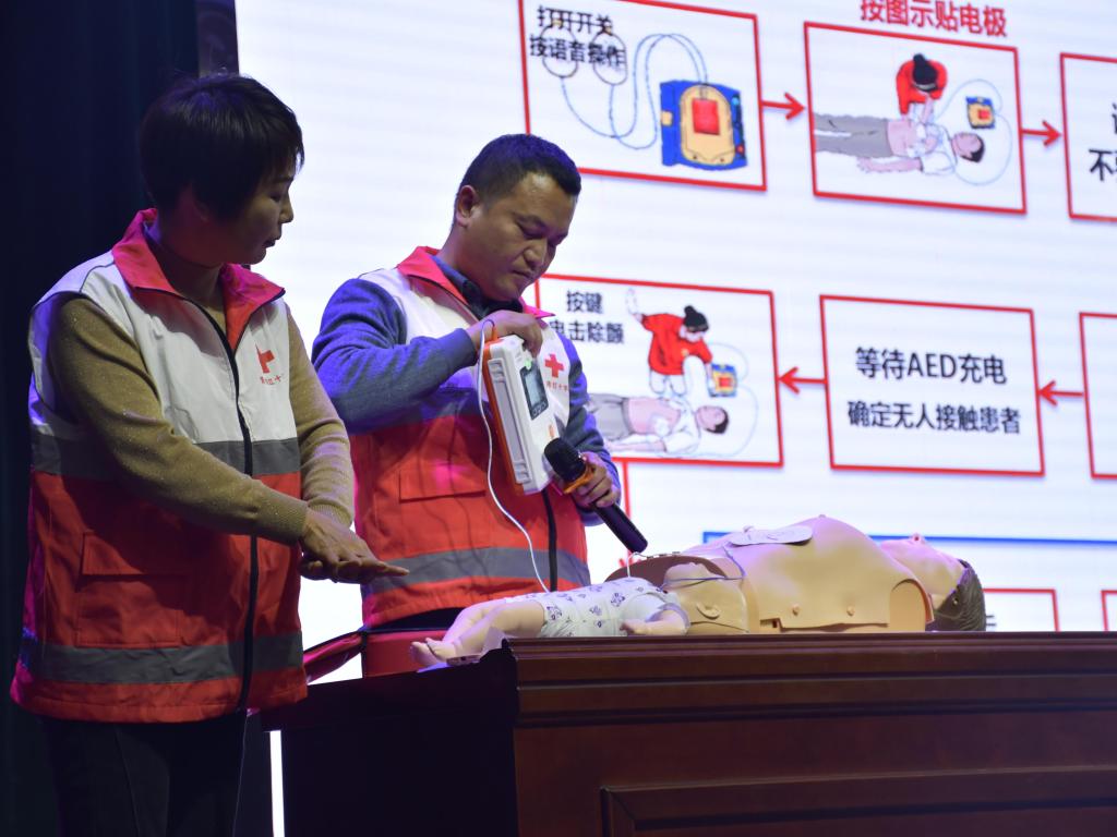 而自动体外除颤器(AED)的使用培训更是此次课程的一大亮点。讲师认真操作AED,从开启设备到电极片的正确粘贴,再到根据语音提示进行电击操作等一系列流程,力求使同学们详细掌握使用流程,以便在关键时刻能够迅速且准确地运用AED为心脏骤停患者争取生机。