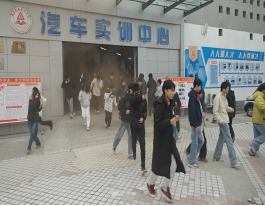 演练开始,模拟汽车实训室内出现“火情”,浓烟弥漫。随着警报声响起,员工们在辅导员的指挥下,迅速按照应急方案,捂住口鼻,弯腰低姿,沿着指定疏散通道快速、有序地撤离至室外安全地带,整个过程紧张高效,井然有序。