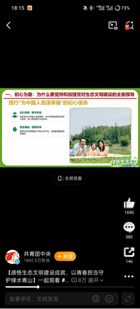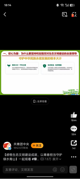本次团课以《坚持和加强党对生态文明建设的全面领导》为主题,是“美丽中国·青春行动”2026年青少年绿色生活实践活动的重要内容。各班共青团员通过微博扫码预约,准时收看直播,认真学习团课内容,深入领会生态文明建设的核心要义。